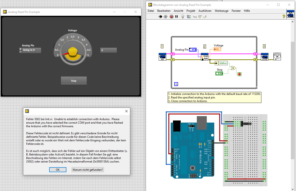 In LabView öffne ich nun das Arduino Beispiel "Analog Pin Read Example". Der Uno und das Poti sind genau so verdrahtet, wie auf der Grafik im Blockdiagramm dargestellt. Beim Drücken des Ausführen-Knopfes beginnt am Arduino die RX Led zu blinken, jedoch nicht die TX-Led. Nach ca. 30 Sekunden erhalte ich den Fehler 5002, es konnte also keine Verbindung hergestellt werden (Screenshot 1).