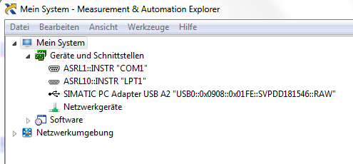 Mit LabVIEW will ich jetzt verschiedene Parameter lesen/verändern. Dazu habe ich mit NI-VISA Driver Wizard einen virtuellen Treiber installiert, der mir einen COM1-Port, LTP1 und einen USB-RAW in LabVIEW zur Verfügung stellt.
