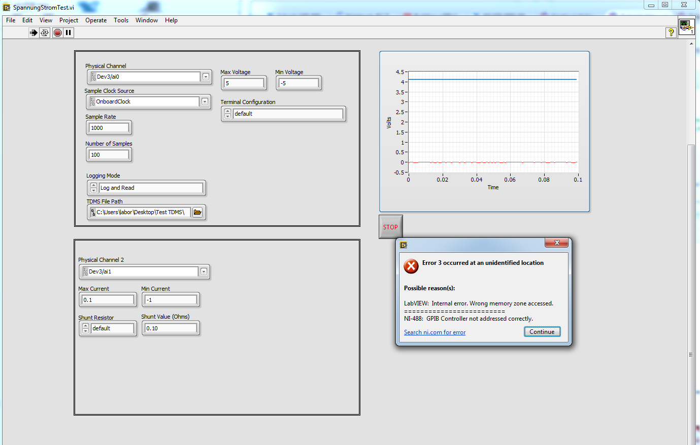 Das funktioniert in der Beispiel-VI "Voltage - Continuous Input" schon mal super.