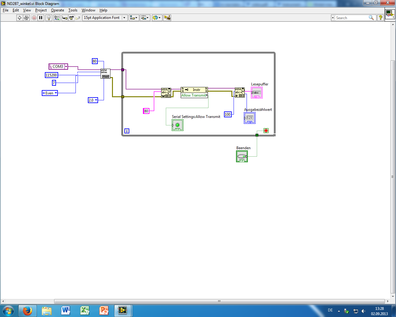 ich möchte ein VI erstellen, mit dem ich kontinuierlich die mit einem Heidenhain Drehgeber und Heidenhain ND287 Anzeigengerät gemessenen Winkelstellungen (in veränderlichen Zeitabständen) auslesen und abspeichern kann.