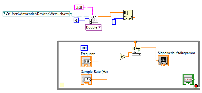 Variante 2: Das Signal wird hier schon einmal dargestellt (ein Anfang Big Grin) aber leider noch nicht kontinuierlich. Eine While-Schleife brachte auch nicht den gewünschten Erfolg.