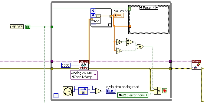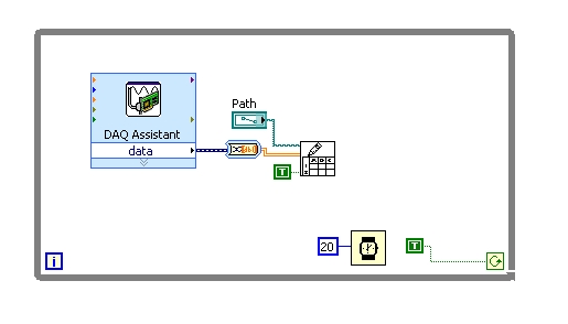 Weder erscheint es mir sinnvoll, im 20ms-Takt Dateien zu öffnen, Daten zu schreiben und die Datei wieder zu schließen, noch erscheint es mir sinnvoll, im gleichen 20ms-Takt DAQ-HW zu initialisieren, zu lesen und wieder auszuschalten. Und das Ganze auch noch endlos vorzuhaben...