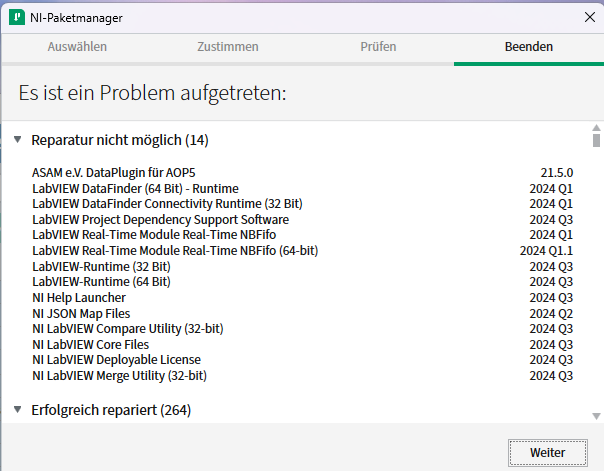 Ich habe mit dem NI Paketmanager erneut eine vollständig Reparatur aller installierten Module versucht, darüber ergab aber entsprechende Fehlermeldung