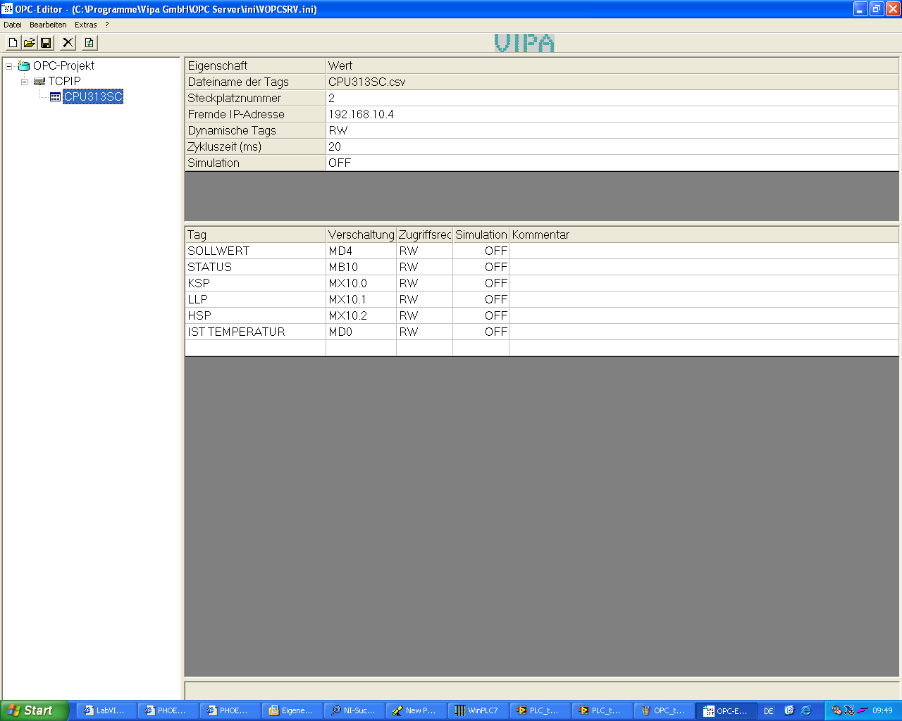 Die Steuerung ist eine SPS von VIPA (CPU 313SC). Den OPC Server habe ich von der VIPA Hompage runtergeladen und eingerichtet. Als Schnittstelle benutze ich Ethernet. Hier mal die Config aus dem OPC Editor.