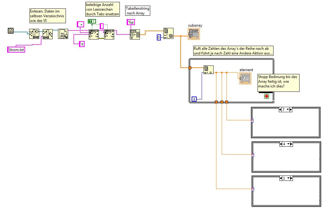ich bin Anfänger mit LabVIEW, nun muss ich aus einer Textdatei die Zahlen der Reihe nach in ein Array schreiben, dies habe ich soweit mit einem abgeänderten Beispiel vom Forum geschafft. Aber nun sollte LabVIEW dieses Array der Reihe nach durchlaufen und bei den Zahlen verschiedene Aktionen ausführen und am Ende des Arrays aus der Schleife gehen.