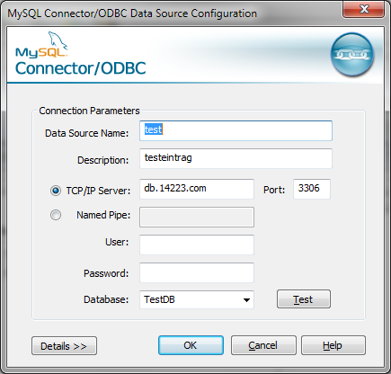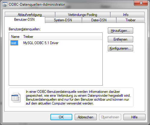 Den Database Driver musst du natürlich an deinen installiertem Treiber anpassen. In meinem Fall war es "MySQL ODBC 5.1 Driver". Was mir aufgefallen ist, das es zwischen Win7 und WinXP unterschiede mit SysDNS und UserDNS gibt. Normallerweise nehme ich immer die SYS DNS. Dies hat aber auf meinem WIN7 Rechner über die dll nicht geklappt. In der Firma habe wir momentan noch WinXP.