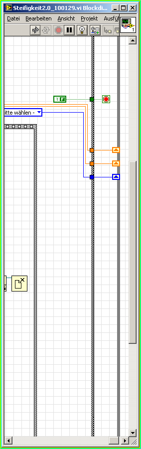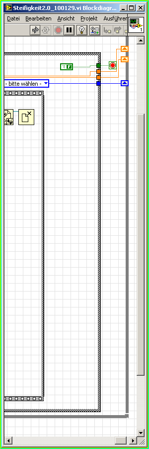kratzens hat hier einen Bug, zumindestens aber eine Inkonsistenz, in LV9f2 ausgedeckt. Der Fehler geht wie folgt beheben - zumindest bei mir: Einmal das komplette MainVI "Steifigkeit2.0_100129" aufräumen lassen. Danach ist plötzlich eine offene Verbindung vorhanden. Diese offene verbindung muss mit samt der kompletten Leitung, die am offenen Stück hängt, gelöscht werden. Danach kann die Verdrahtung neu erstellt werden.