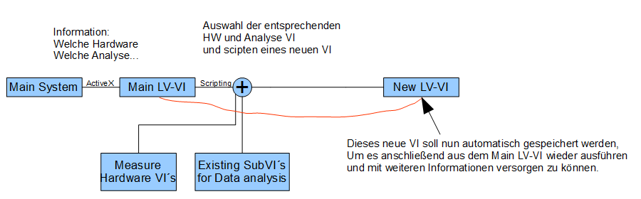 Ich habe ein LV übergeordnetes Hauptsystem, dass LV über ActiveX steuern soll. Dabei soll es nur eine Schnittsetlle zwischen den beiden Programmen geben (ein "kommunikations vi"). Diesem VI werden Informationen zur Verfügung gestellt wie die Auswahl des Messgerätes, Auswahl der Datenanalyse,... Anhand dieser Informationen werden dann entsprechende sub-vi´s ausgewählt un verschaltet. Bis dahin sehe ich kein Problem und hab das anhand eines sehr einfachen Beispieles per scripting umgesetzt. Jetzt komme ich aber an einem Punkt nicht weiter: