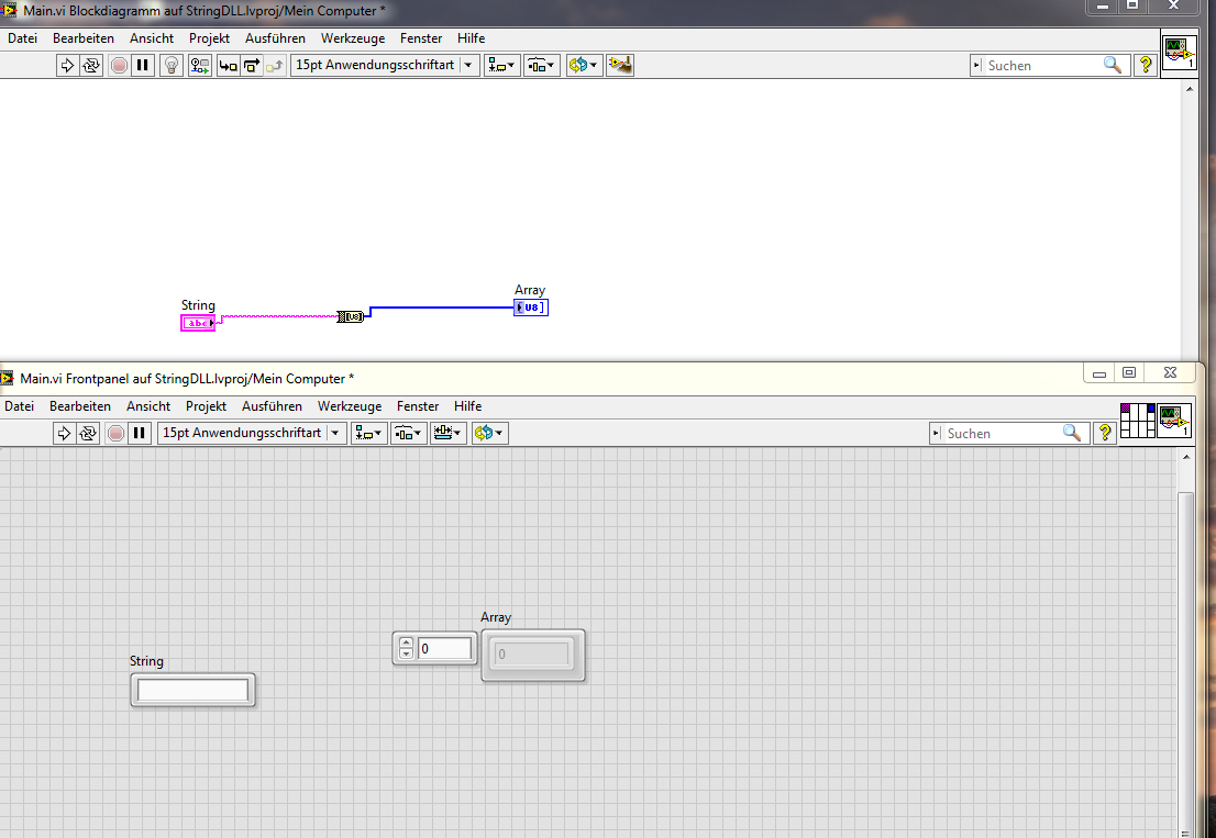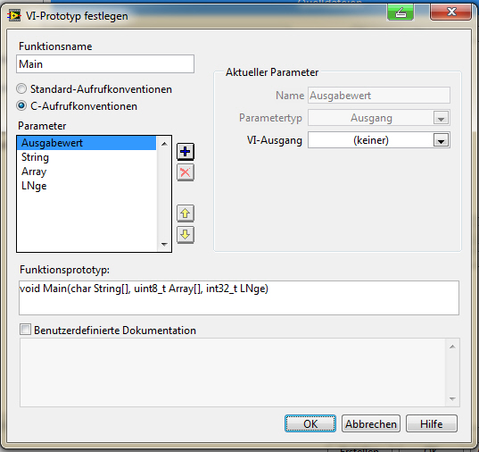 Labview erstellt im Headerfile folgende Funktion : void __cdecl Main(LStrHandle *InputString, Int32Array *Array);
