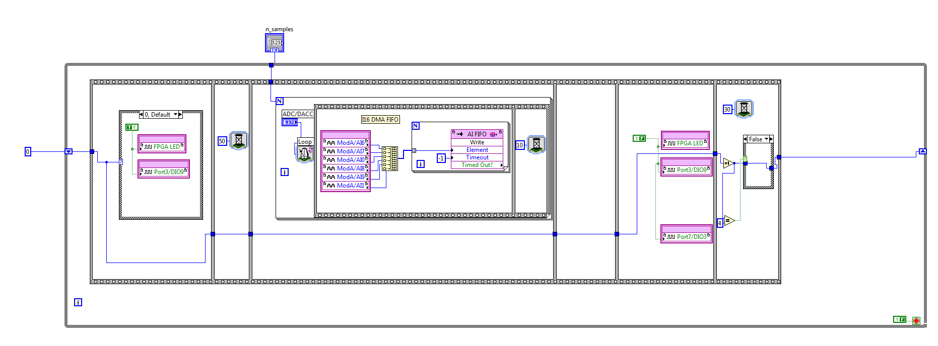 ich habe seit kurzem ein sbRIO9632 und die FPGA/Realtime Programmierung ist fuer mich neu. Ich bin derzeit dabei ein Programm zu schreiben, welches dass zeitmultiplexte einlesen eines AD-Wandlereinganges erlaubt. Dabei soll alle 100msec ein entprechendes Pin gesetz werden und waehrenddessen der AD-Wandler eingelesen werden. Die dabei erhaltenden Samples (Bsp. 256) sollen dann gemittelt werden.