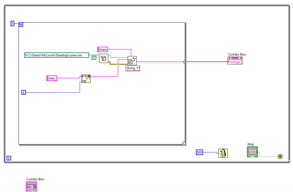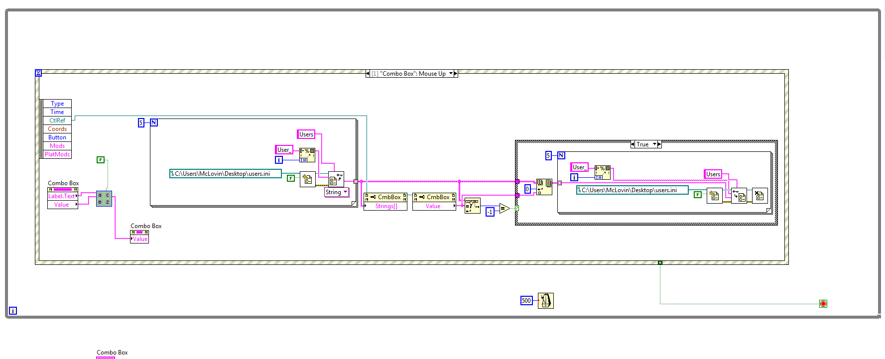Ich habe versucht auf Basis von dem noch ein bisschen weiter an der Lösung zu arbeiten. Ich habe vergessen zu schreiben, dass eine Applikation aus dem ganzen gebaut werden soll und auch nach Beenden und Neustart des Programms die Letzten Eingaben in der Liste bleiben sollen. Die Sache scheint soweit zu funktionieren, allerdings bin ich mir nicht sicher, ob sie so "richtig" ist - ich vermute, dass ich beim Lesen 5x die INI Datei öffne, aber nicht wieder schließe und dafür beim Schreiben 5x öffne und schließe, dabei würde das ja ein mal genügen. Ich habe aber leider keinen weg gefunden, die Symbole ausserhalb der Schleife zu positionieren. Habe ich mit meinen Vermutungen recht, oder kann man das so lassen?