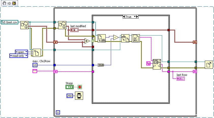 Also wenn du immer den Wert auf der untersten Zeile verwenden willst, so kannst du beim Read-VI auf Zeilenweise umstellen und immer vergleichen ob sich die Dateigrösse geändert hat (ich gehe jetzt mal davon aus, das keiner der alten Werte gelöscht wird)