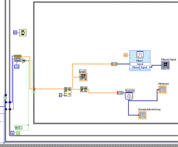 Mit LabVIEW werte ich den AD Konverter Spider8 aus. Das Signal möchte ich einmal unverändert darstellen und einmal das tiefpass gefilterte Signal. Nur Leider macht der Tiefpass entweder nichts (zeigt das ungefilterte Signal an) oder er zeigt gar nichts an.