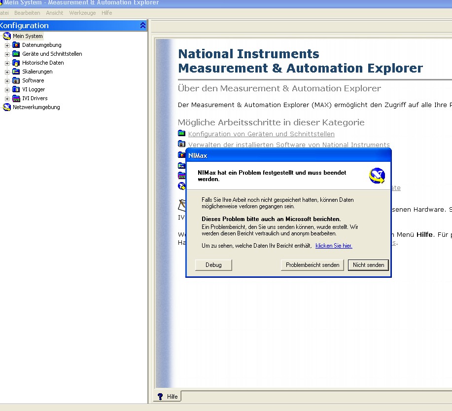 Ja weiterhin stürtzt der MAX dann ab sobald man das Programm gestartet hatte. Beim ersten Mal hats wieder funktioniert als ich Ni-Daq 8.1 geupdatet hatte und nun mit neuester Version ging das nicht mehr und MAX kann man auch nicht deinstallieren also hab ich gedacht reparieren muss mans doch können. Mit CD-Installern geht das nicht. So wollte ich das ganze System neuinstallieren und habe via Systemsteuerung/Software/NI-Software dann versucht genau das zu tun aber siehe da MAX geht nicht zu deinstallieren ohne den Rest aber zu reparieren! Hier lässt sich jede Komponente reparieren die installiert wurde was bei den CD-Installern nicht mit angeboten wird.