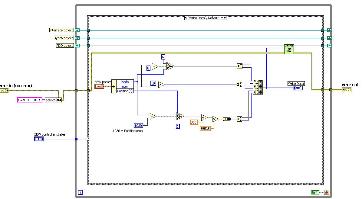 Weiterhin solltest du (nachdem die Begriffe klar sind) einen Blick auf die Examples der CANopen-Lib werfen. Die sind wirklich sehr gut. Da wird alles einzeln erklärt. Als Ergänzung dann mein VI im Anhang, wo alle Einzelkomponenten, die man so brauchen könnte, verhanden sind. Es handelt sich dabei nur im die Kommunikation mit einem Temperatursensor (also 5 Stufen niedriger als ein Driver), aber das Prinzip von CANopen ist überall gleich. Nur die Anzahl der erforderlichen Kommandos ändert sich.