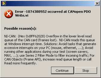 Zitat:Mmhh, ich hatte diesen Fehler noch nie, arbeite aber auch wie gesagt auf einem PXI und nicht in Windows. Abhilfe könnte vielleicht ein selteneres Senden der PDO's schaffen?! Sync erhöhen?