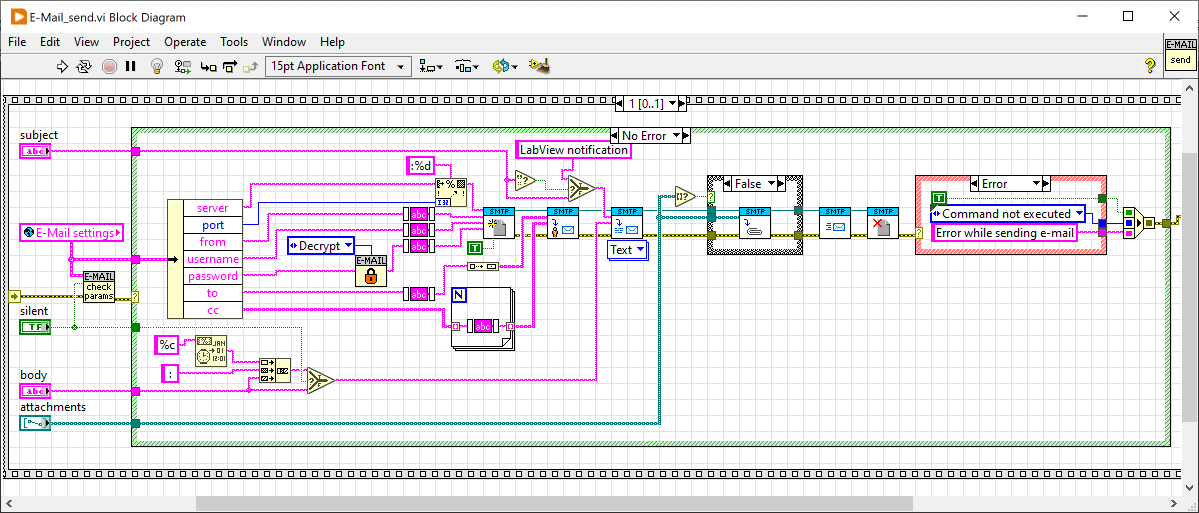 Das will nicht - ok, dann benutze ich eben die smtp-VIs, die LabView anbietet. Das Ergebnis ist im nachfolgenden Bild zu sehen.