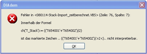 Ich habe ein Script erstellt, das ein paar neue Kanäle aus vorhandenen berechnen soll. Doch schon bei der ersten Berechnung bricht DIAdem mit der beigefügten Fehlermeldung ab. Hier (die wichtigsten) Auszüge aus meinem Skript:
