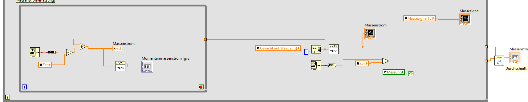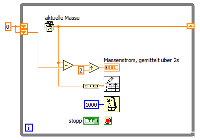 Ich soll eine Massenstromerfassung (Diagramme) für eine Vorhandene VI für eine Schwingförderer erstellen. Die Formel für Massenstrom ist die Massendifferenz durch eine Zeitdifferenz ṁ= dm/dt = (m2-m1)/(t2-t1)