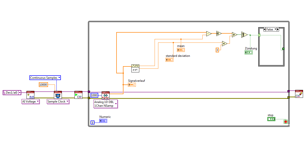 Zweite Frage: An den A/D-Wandler habe ich im Moment nicht angeschlossen also es ist nur Grundrauschen . Aber trotzdem wird ständig gezündet ( rotes Leuchten ), d.h: in State Maschine wird ständing zwischen 4 und 5 gehüpft. Muss ich da in dem Programmteil für DAQmx das Signal filtern oder so was? Was mache ich da Falsch?