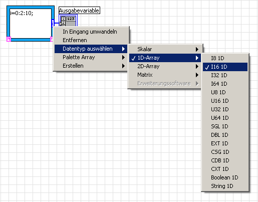 Bei LabVIEW 8.0 bekomme ich bei Mathscript die Datentyp-Auswahl wie sie im Bild im vorherigen Post zu sehen. Wenn ich dies aber bei LV 8.6 mache, dann kann ich nur zwischen dbl,cdb, boolean und int auswählen, aber kein int. Die Versionen sind also unterschiedlich. Ich benutze aber LV 8.6. Nachträgliches Konvertieren (außerhalb des MathScript-Knotens) bringt kein Vorteil, da in MathScript selbst das Array schon zu groß wird.