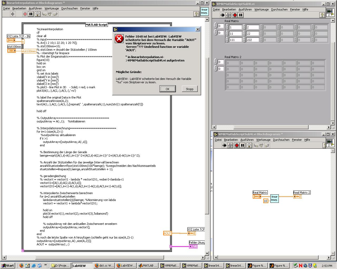 Ich möchten ein MatlabScript in LabVIEW nutzen. Ich benutzen in meinem Hauptprogramm bereits ein SubVi welches ein MatlabScript enthält - funktioniert wie gewünscht. Nun habe ich ein weiteres SubVi mit einem neuen MatlabScript nach dem gleichen Prinzip erstellt und ich bekomme jetzt die Fehlermeldung: "1048" - "LabVIEW scheiterte daran die Variable vom Scriptserver zu lesen".
