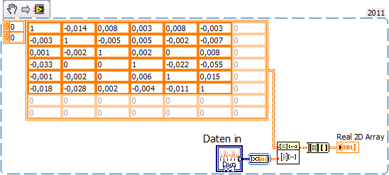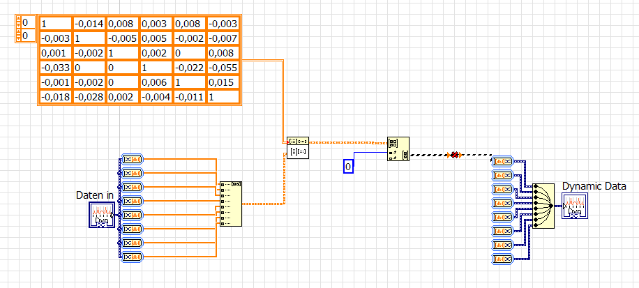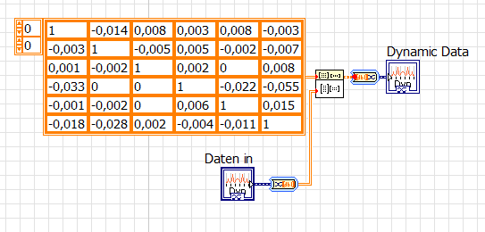 Mit dieser Information und der Annahme, dass labview Matrizen richtig rechnet hat das funktioniert. Nach einer mit Testsinus beaufschlagten Virtuelle-Karte und anschließender Rechnung zufolge arbeite das Programm korrekt.
