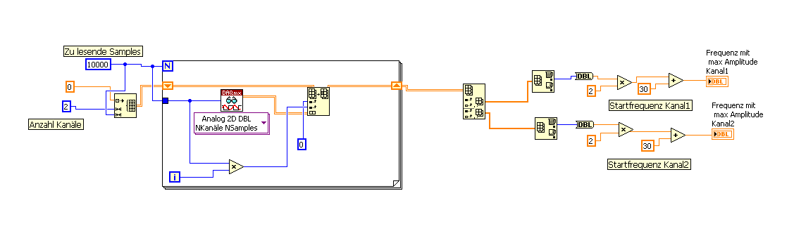 Also, ich bekomm vom DAQmx Lesen-VI ein 2D Array DBL. Das ganze befindet sich in einer For-Schleife mit x Durchläufen.
