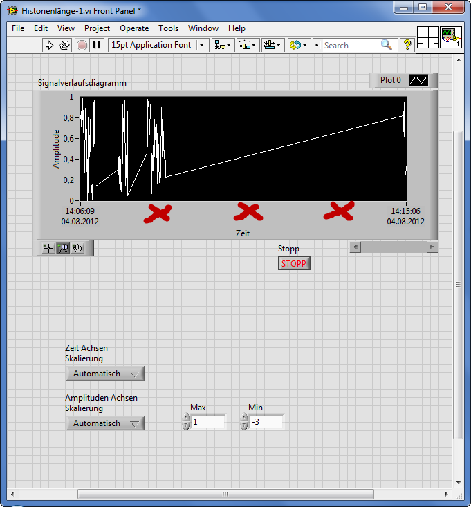 (04.08.2012 13:52 )Lucki schrieb:  Mir dem Signalverlaufsdiagramm wird das nicht gehen. Enweder normalen Graph verwenden - dann mußt du dich aber selbst um den Historybuffer bemühen, und das dt müßte konstant sein. (Wenn nicht, dann XY-Graph). Oder den Express-XY-Graph verwenden, der bringt auch einen eigenen Historybuffer mit: