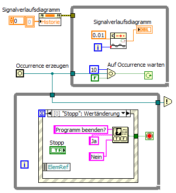 ich bin neu hier und habe ein kleines Problem. Ich habe ein VI zur Steuerung einer Syntheseapparatur, mit While-Schleife und Case-Struktur, programmiert. Innerhalb der While-Schleife sind noch zwei Sub-VIs zur Temperatursteuerung und ein kleines Programm mit grafischer Ausgabe zur Aktivitätsüberwachung (analoge Spannungsmessung). Die Case-Struktur wird mit einer Enum Konstanten selektiert. In mehreren "Wait" Fenstern ist das Express VI -Meldung an Benutzer- implementiert, wenn der Programmablauf dort ankommt erscheint die Meldung, die kommen soll, mit den beiden Schaltflächen OK und Abbrechen. Während das Fenster auf dem Bildschirm ist, kann man leider die Temperaturanzeigen und die Spannungsmessung nicht mehr verfolgen, da die Anzeigen "eingefroren sind. Das Programm an sich läuft allerdings im Hintergrund weiter. Das erkennt man daran das die Spannungsmessung auf der Zeitachse einen Sprung in der Zeit macht der der Wartezeit entspricht, auch die Spannungswerte werden gemessen.