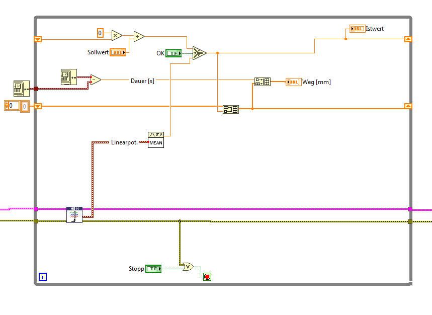 Also wenn ich das Linearpoti auf physikalisch 0mm setze und dann bspw. an dieser Stelle -25mm angezeigt haben möchte, soll der OK-Button gedrückt werden und damit der gemessene Wert (MEAN) die -25mm annehmen. Dennoch soll das ganze dann weiterhin gemessen werden können. Sprich, wenn ich physikalisch 50mm einstelle sollte mir nun automatisch +25mm angezeigt werden und natürlich auch alle Werte während des verstellen des Wegaufnehmers. Deshalb auch das untere Schieberegister, damit die Werte im Graphen immer aneinandergereiht werden.