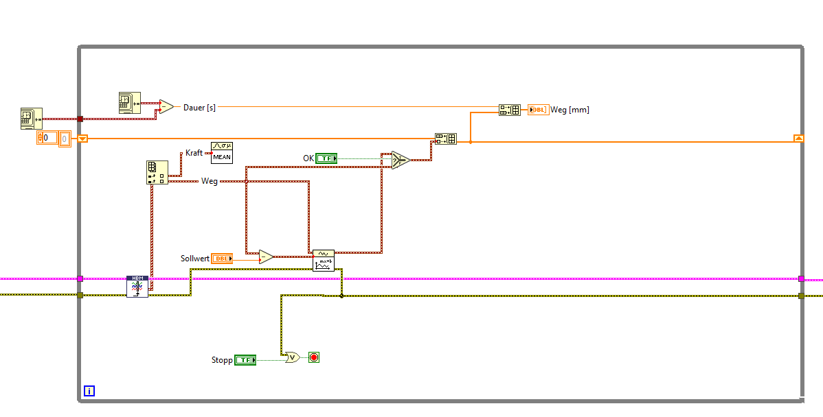 Der Sollwert stellt sich nun ein, aber leider nur 1x & springt dann zurück auf den alten Wert. Was auch nach meiner VI-Konstruktion logisch ist. Weil nach Betätigen von Select-VI einmal den true-Wert ausgegeben wird & danach wieder der false-Wert.