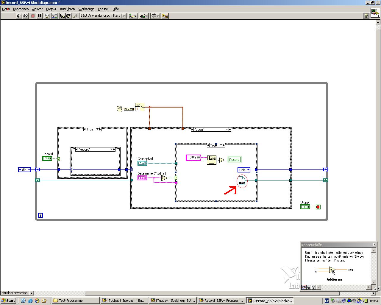 Ich will auf dem Frontpanel ein Button haben, das z.B. speichern heißt. Wenn ich draufdrücke, sollen all meine Messdaten in eine .tdm abgespeichert werden. Beim Speichern sollte ich natürlich auch wählen können, wo und unter welchen Namen ich sie abspeichern möchte.