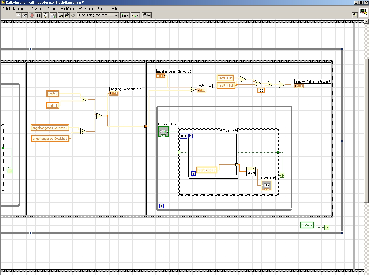 Das 100 mal Auslesen hab ich nur gemacht, weil ich mit einem Schalter steuern will, wann das VI die Kraft ausliest, ich dafür ne Schleife gebraucht hab und 100 dann als beliebigen Wert genommen hab. Mir ist keine einfachere Variante eingefalln um dem VI zu sagen "Wenn ich den Knopf drücke, musst du den Kraftwert auslesen und dir als Kraft 1 (bzw 2 oder 3ist) merken"