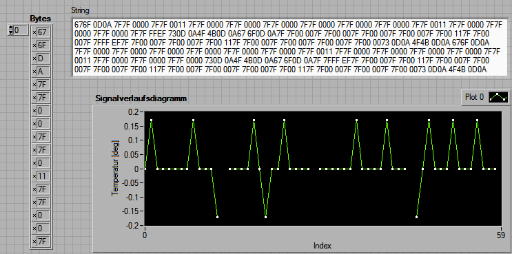 Zwischen den Datensätzen von Typ 7F7F XXXX gibt es andere Daten mit einer ungeraden Anzahl von Bytes. Da ist es natürlich etwas unglücklich, die Bytes im String zu paaren, also z.B 7F7F XXXX. Besser wäre in diesem Falle die Strindarstellung ohne Leerzeichen oder mit Leerzeichen zwischen jedem einzelnen Bytes, also 7F 7F XX XX. Das hat aber mit der Auswertung in meinem VI nichts zu tun, das funktioniert trotzdem, es ist nur eine Frage der Optik - die z.B. Dich verwirrt.