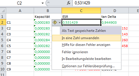 Die grünen Werte verwenden ein Komma, die roten einen Punkt. Außerdem gibt es bei den grünen Werten noch eine "Hinweismarkierung" an der linken oberen Ecke der Zelle: wird dort evtl. eine Zahl als Text formatiert dargestellt?