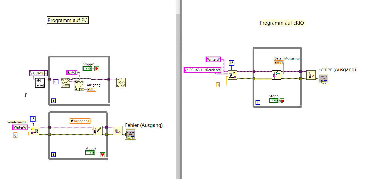 Wenn du am PC als Sendernamen "WriterW" verwendest, dann musst du am cRIO einen anderen Readernamen verwenden. Außerdem sollte die WriterURL "//IP-Adresse-PC/WriterW" lauten.