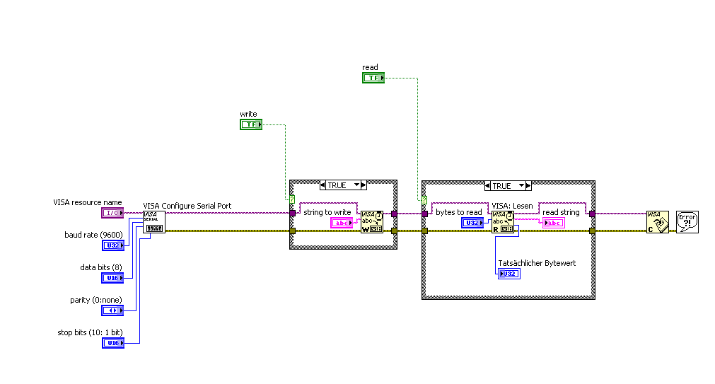 ' schrieb:Wenn Du an Deinem VI "VISA confugure Serial Port" ein false-Konstante am richtigem Eingang anschließt, dann ist das außerhalb meiner irdischen Erfahrungen, daß sich das von selbst auf true ändert.