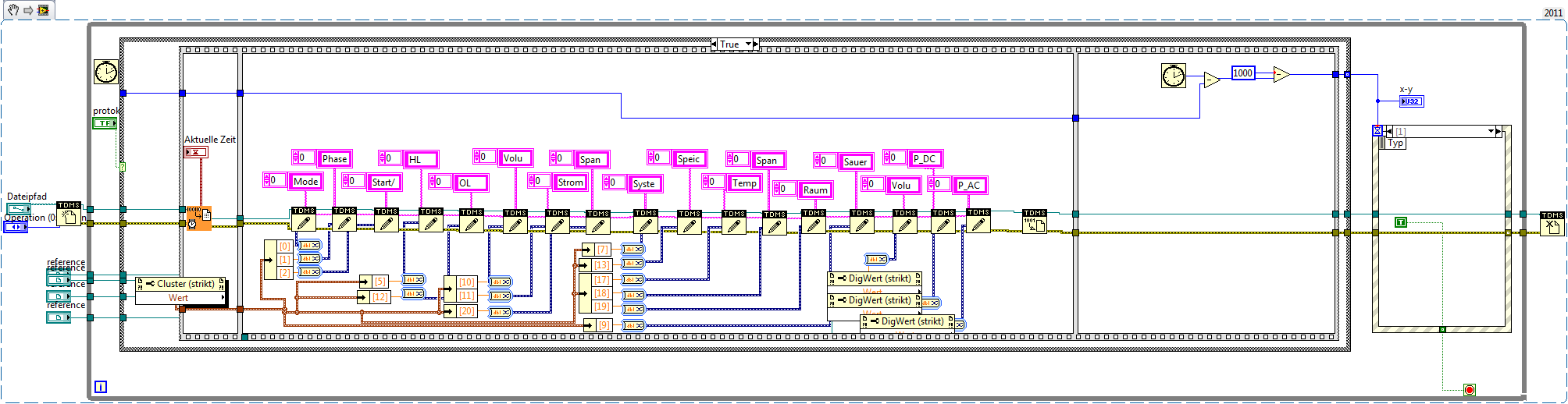 zur Zeit bearbeite ich die Messwerterfassung eines alkalischen Elektrolyseurs über SOAP und OPC. Die Daten sollen, versehen mit einem SubVI zur Zeitstempelerzeugung, jede Sekunde in ein TDMS-File geschrieben werden. Um die Daten mit konstanten Zeitabständen abzuspeichern erfasse ich am Anfang den Timer, lasse die Daten schreiben, leere die TDMS und bilde dann die Differenz zwischen dem aktuellen und dem Anfangstimer und diese Differenz wird dann von den 1000ms abgezogen. Somit wollte ich eigentlich sicherstellen, dass wenn der Code bspw. 200ms zur Abarbeitung benötigt, die Eventstruktur nur noch 800ms wartet. Die Eventstruktur deswegen, weil das Programm auf ein "Messung beenden" auf dem Frontpanel unmittelbar reagieren soll.
