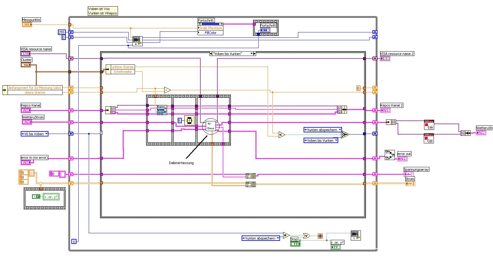 Erst hatte ich das Multimeter in Verdacht, aber wenn ich das einzeln auslese, dauert die Messung zwischen 30-150ms. Ich könnte mir jetzt vorstellen, dass vielleicht die ungünstige Verteilung der Bereiche in der USB-6229 den Monsteranteil an der Messzeit hat. Oder hab ich, abgesehen von der etwas wirren Verdrahtung, nen grundsätzlichen Fehler bei der Programmierung gemacht?