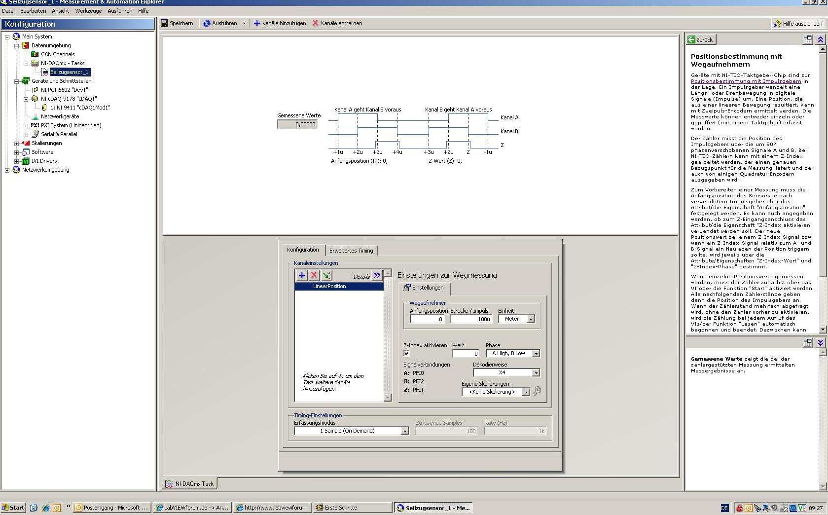 ich soll mithilfe eines Seilzugsensors (Inkremenetalencoder (s. Anhang)) die Wege aufnehmen. Da die Kabellängen zwischen dem Sensor und der Messkarte über 10m sind, sollen, laut dem Datenblatt, alle 6 Kanäle des Sensors verwendet werden.