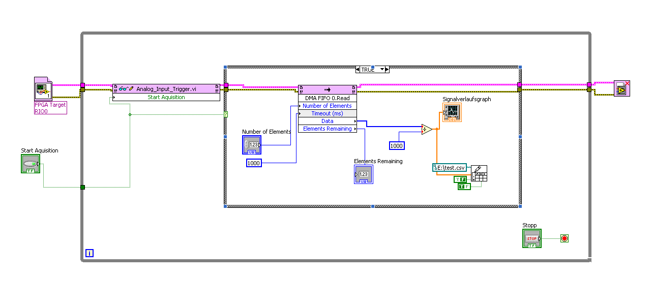 Meine Versuche sind schon immer daran gescheitert, dass er keinen Dateidialog öffnet wenn ich das Programm starte. muss ich das VI dann in meine Schleife integrieren oder außerhalb der Schleife? Die Aufzeichnung soll schon recht lange (Stunden) laufen, deshlab auch nicht ununterbrochen Werte in die Datei schreiben. Ist es vielleicht ein Problem, weil ich ein Array von Datentyp double hab? Allein das angehängte Beispiel funktioniert schon nicht, weil er keine Datei mit dem Namen test.csv erstellt. Ich denke, dass ich da grundsätzlich noch etwas Schwierigkeiten hab.