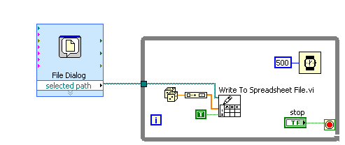 Für besser halt ich, bei der Initialisierung des Main-VIs den Dateidialog zu führen und die Datei erst mal nur zu öffnen (Man hat dann eine Dateireferenz). Dann im Hauptteil die VIs "In Textdatei lesen/schreiben" verwenden, und beim Beenden die Datei schließen.