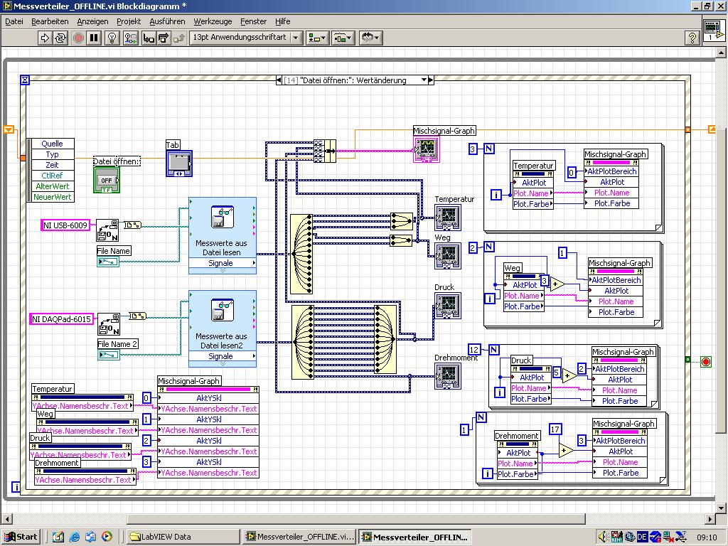 ich lese mit einem anderen Vi Sensoren aus und speichere diese in eine *.csv-Datei (Tabulatorgetrennte Textdatei). Ich hab ein zweites Vi erstellt um die Messwerte offline auszuwerten. Zu meinem Problem: ich benutze das ExpressVi "Messwerte aus Datei lesen"...wenn ich hier "Segmente in Originalgröße abrufen" auswähle, bekomme ich einen leeren Graphen. Wie kann ich das denn trotzdem variabel gestalten? Ich habe Messdateien mit z.B. 3600 Werte, oder 6000 Werte u.s.w.