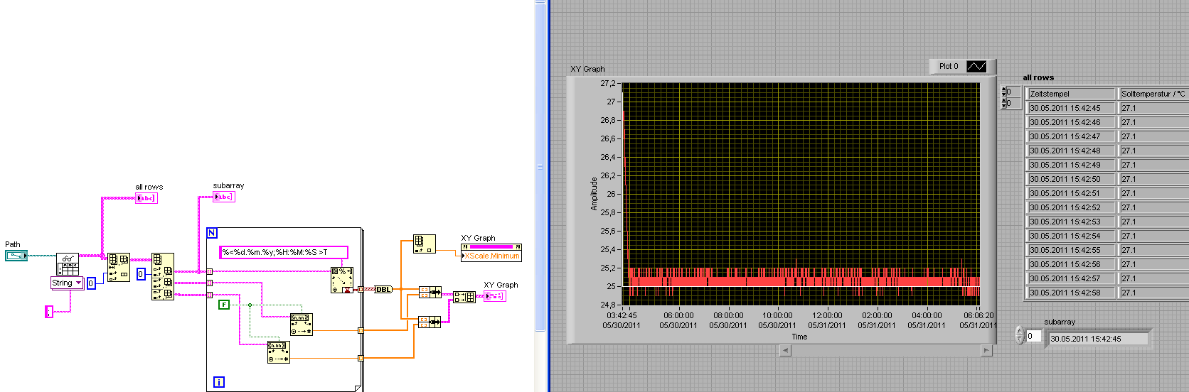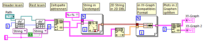 Außerdem: Das SV-Diagramm macht nur Sinn, wenn Du, während die Werte online gemessen werden, die bis zum jeweiligen Zeitpunkt erfassten Werte verfolgen willst. Wenn aber, so wie hier, die Werte aus einer Datei eingelesen werden, dann wäre ich auch dafür, einen XY-Graphen zu verwenden.