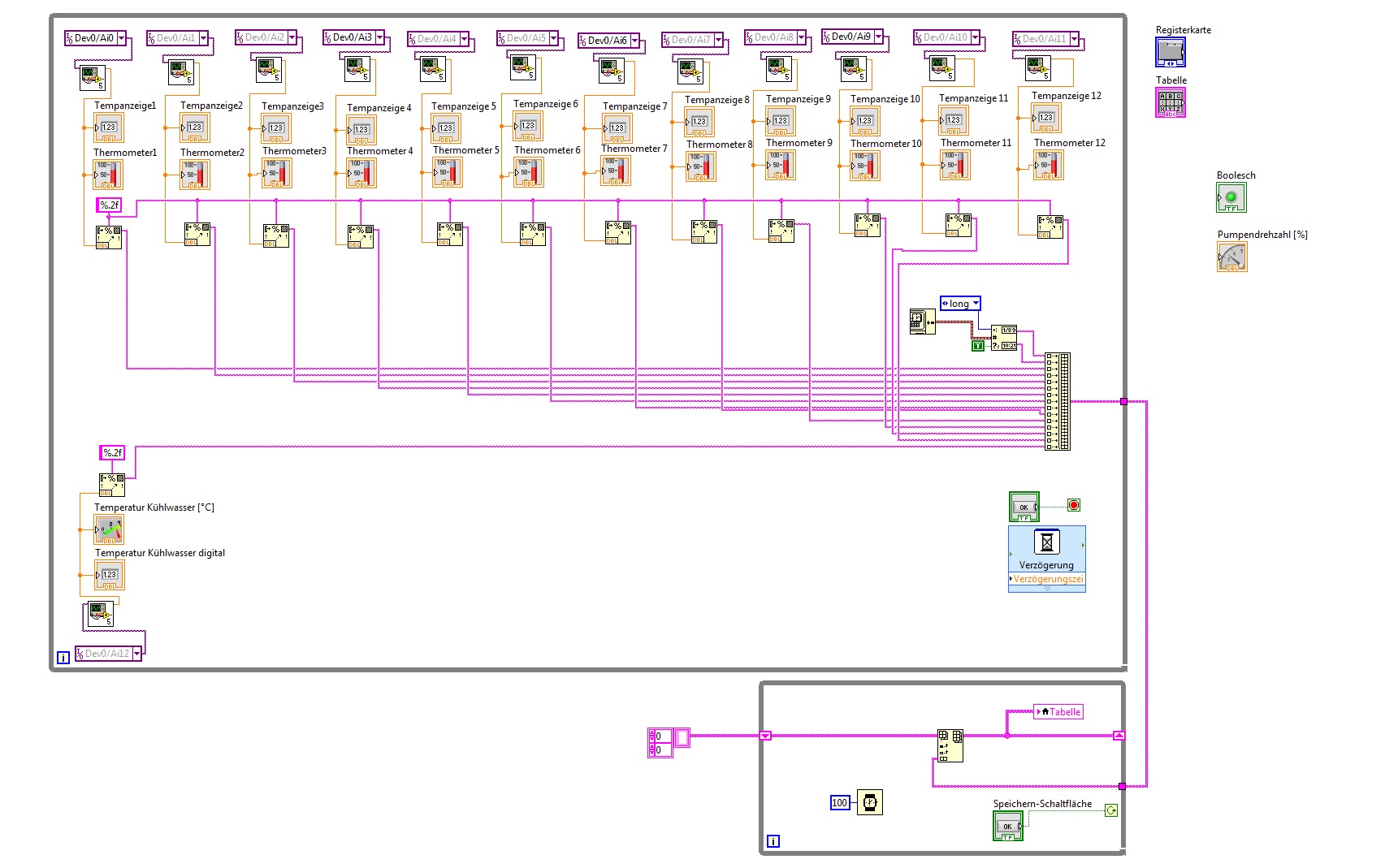 ich beschäftige mich seit einigen Tagen mit LabView 2012 (für Win7). Mein VI soll die Messwerte von 13 Thermoelemente mit je 10 Messungen pro Sekunde in eine Tabelle schreiben. Das Messen der Temperaturen klappt schon ganz gut, allerdings werden meine Werte nicht in die Tabelle geschrieben. Ich packe mal einen Screenshot des Blockdiagramms in den Anhang. Ich vermute, dass meine Werte als String nicht einfach Schleifen übergreifend wiederverwendet werden können. Sprich eine einfache Verbindung zwischen den beiden while-Schleifen ist offensichtlich nicht zulässig?! Ich finde aber leider keine andere Lösung.