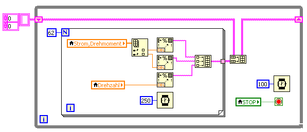 Die Tabelle Funktioniert nun, leider scheint der STOP Schalter nun das Programm nichtmehr zu beenden. Bevor ich die Schleife für die Verarbeitung der Messdaten eingefügt habe ging dies noch. Liegt es daran das ich zuviele Schleifen im Programm habe oder gibt es irgendwo einen Konflikt?