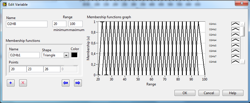 Ich soll ein Fuzzysystem samt Memberships, Variablen und Regeln erstellen. Die verwendete Version ist 9.0. In diesem System soll ich zuerst eine Variable erstellen. Diese Varibale hat verschiedene Memberships (gleichmäßige Dreiecke). Das habe ich soweit geschafft.