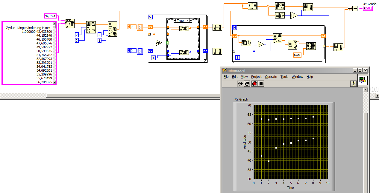 Die blauen Linien sind die Anzahl der Zyklen, welche von einer For-Schleife abgegriffen werden. Die dickere blaue Linie stellt ein Shift-Register dar, welches die Anzahlen der Zyklen in einem Array speichert. Analog funktioniert das ganze mit den orangenen Linien, diese sind Werte aus der Messkarte für die Länge. Die dickere orangene Linie ist benfalls ein Shift-Register, welches alle Werte speichert und an das Array weitergibt. Beide Arrays werden gebündelt und in den Graphen gepackt.Wie kann ich nun die Min/Max-Werte am Besten abgreifen?