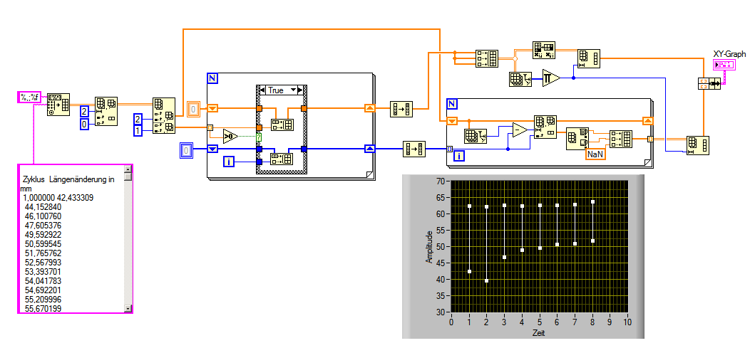 Die For-Schleife zählt die Anzahl der Zyklen hoch, in einem Array werden Daten gespeichert, welche von einer Messkarte ausgesendet werden (Längenänderungen werden hier erfasst.). Also es werden pro Zyklus alle auftretenden Längenänderungswerte in einem Array festgehalten und "just in time" per lokale Variable in den Graphen geplottet.